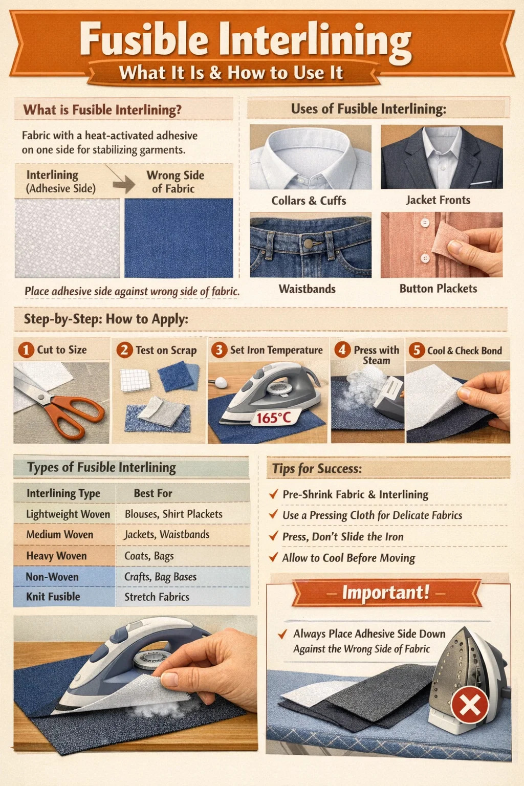 | Jenis Interlining | Terbaik Untuk | Padanan Fabrik | Suhu Besi |